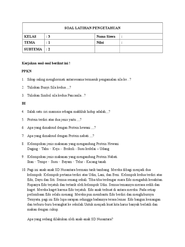 Soal Latihan Pengetahuan Tema 1 Sub 2 Kelas 3 Fix