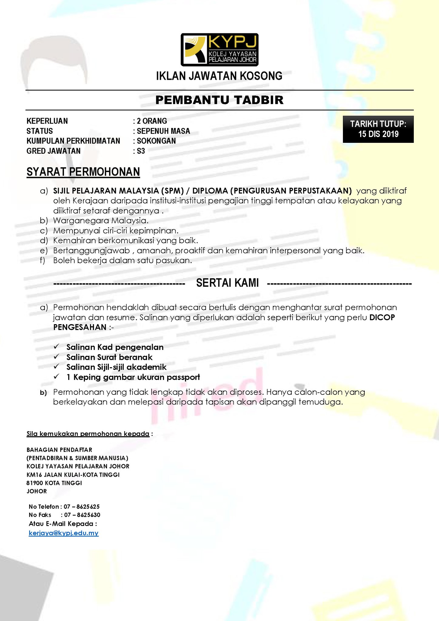 Kolej Yayasan Pelajaran Johor On Twitter Jawatan Kosong Pensyarah Rekabentuk Dalaman Pembantu Tadbir Kini Dibuka Kami Mencari Calon Calon Yang Berkelayakan Untuk Mengisi Kekosongan Tarikh Tutup Permohonan Adalah Pada 15 Disember 2019